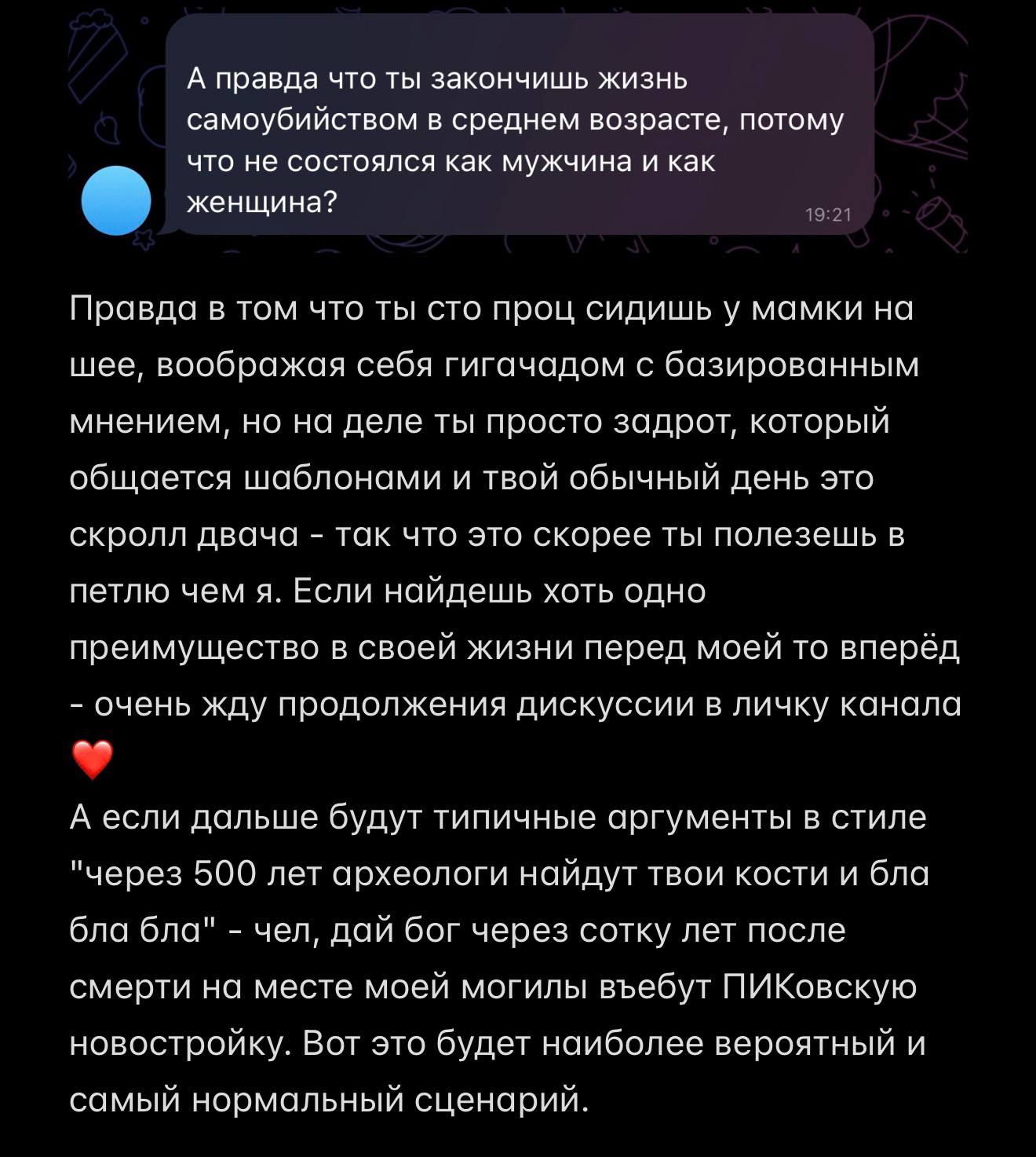 >>26120838 Ну это хуйня, ему шкальник пишет. Денис - мутант. Но желать ему смерти или троллить на тему подобной хуйни, это бредик. Можно поржать над его желанием быть томной телочкой, это да.