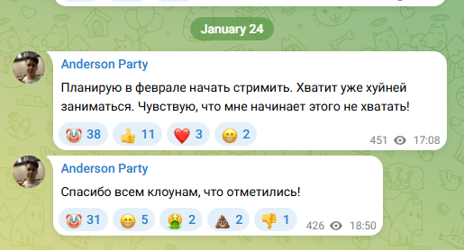 >>26144947 >нет ни одного анона кто подписался раньше или хотя бы в этот год Ты давай не обижай меня. Я настолько опущеный чемодан, что в те года занюхивал каждый пук Жопича и молился на подрубы, нон-стоп мониторя группу Стримсуки. Т.к. тогда же телеги никакой не было, сам Илюха нигде анонсы особо не давал, а в Стримсуки типы жёстко мониторили ситуацию по подрубам.