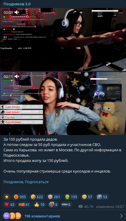 За 100 рублей продала дедов. А потом следом за 50 руб продала и участников СВО. Сама из Харькова, но живет в Москве. По другой информации в Подмосковье. Итого продала жопу за 150 рублей.