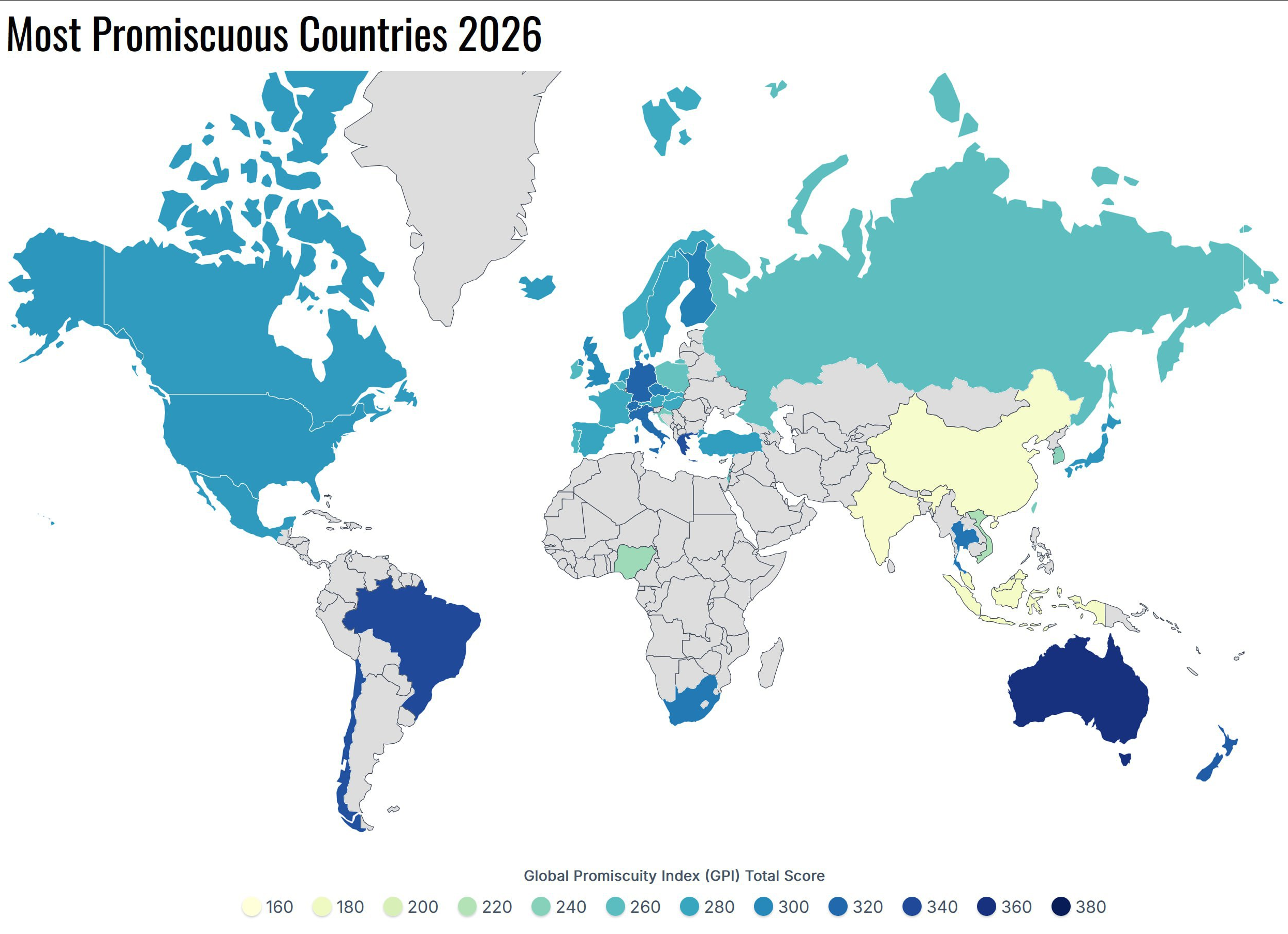 Россия заняла 32-ю строчку с показателем 258,72 балла. Средний возраст потери девственности в стране составил 18,7 года, среднее количество сексуальных партнеров на одного человека — девять.