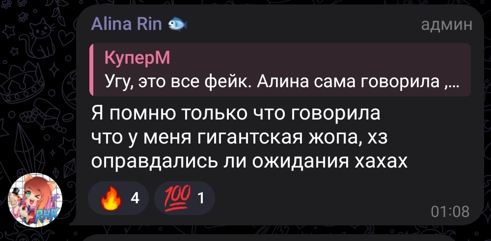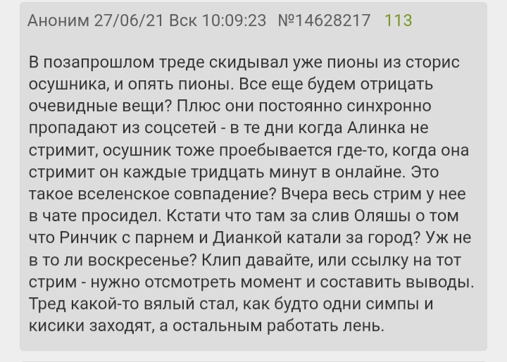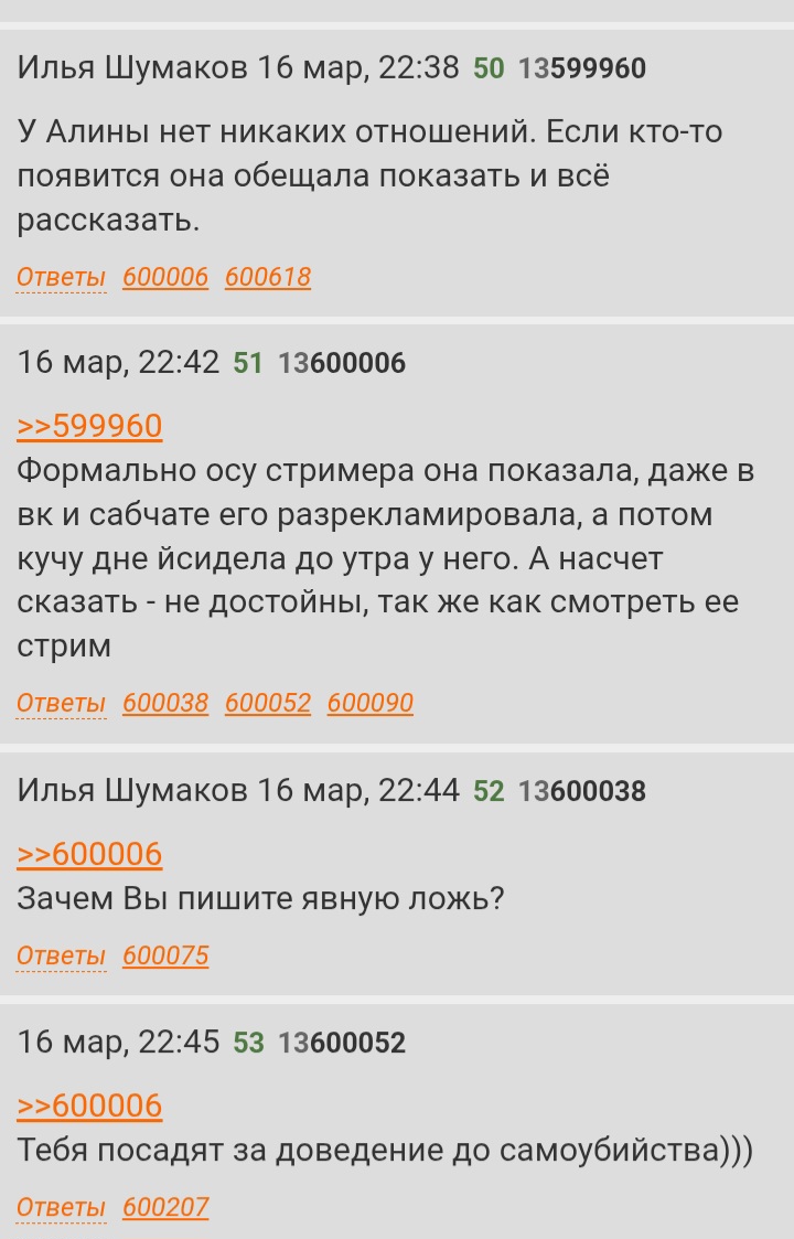 Кто то реально верит, что параноидальная шизичка Алина стала бы ебаться с рандом типом ставя под удар свою годами выстроеную перед кисиками целомудренную репутацию? Вы даже больше шизики чем я думал.