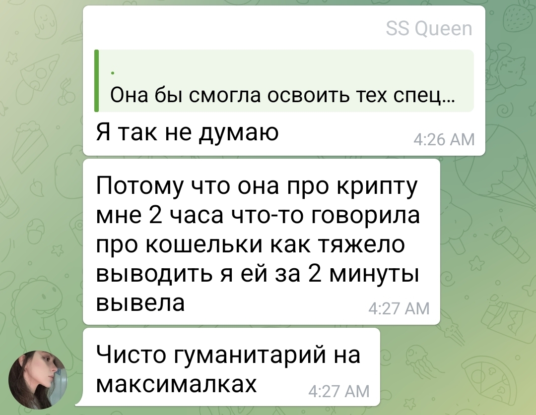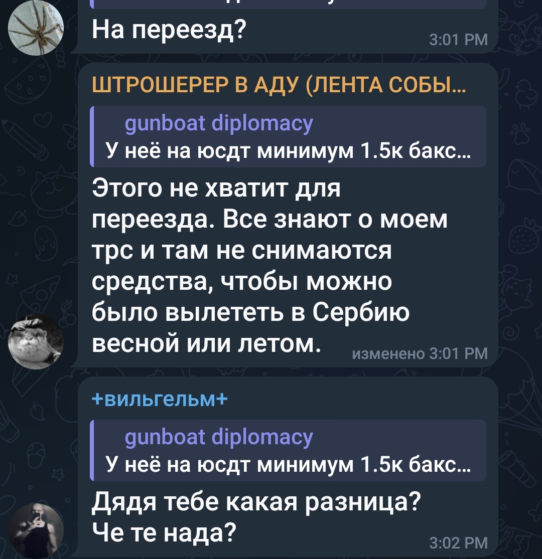Так, стоп, но ведь крипту увёл (не)фиктивный (не)муж, когда его пидорнули в тцк, и у Дашули 7 месяцев назад было всего несколько сотен долларов, и она божилась, что со дня на день пойдёт мыть толчки в ТЦ. 7 месяцев жила без денег и еды, зато откуда-то взялись новые шмотки и новые пынеходики, зальчик оплачен и за ЖКУ в квартире.