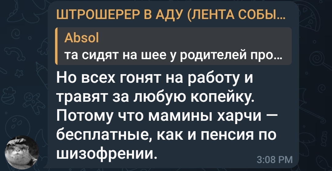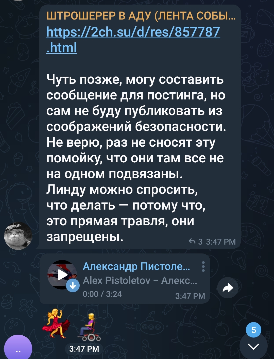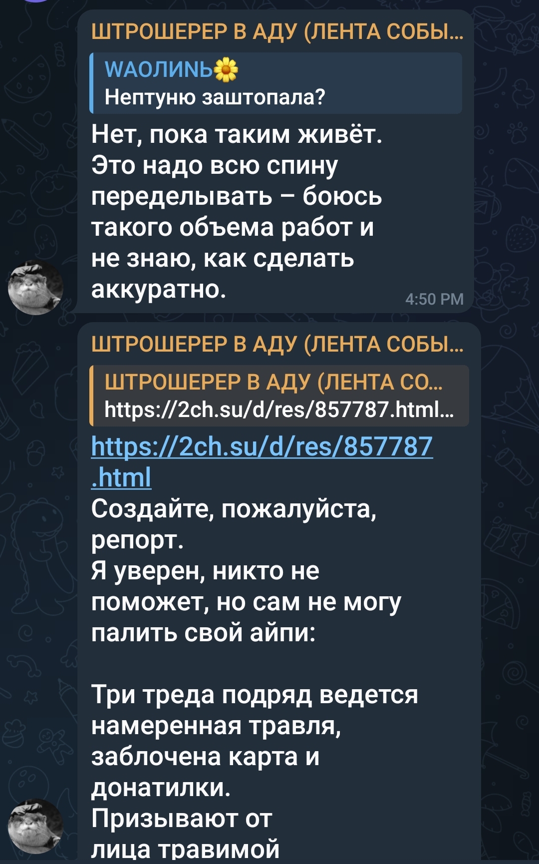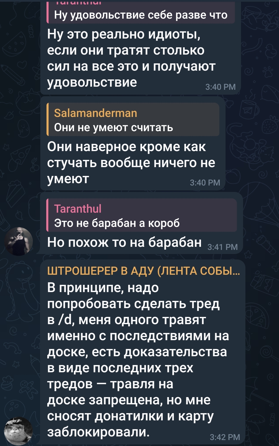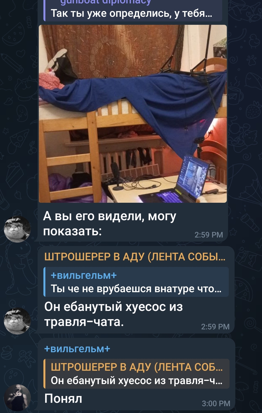 Штрошерер в открытую глумится над психбольной, но при этом сама сидит в чятиках с такими же как она ТП и пытается проработать травмы от нарцисса САШИ. Втайне хочет уволиться из ложа Гнатюка и съехать обратно в ВН на БМ, но не может. Поможем ей в этом!