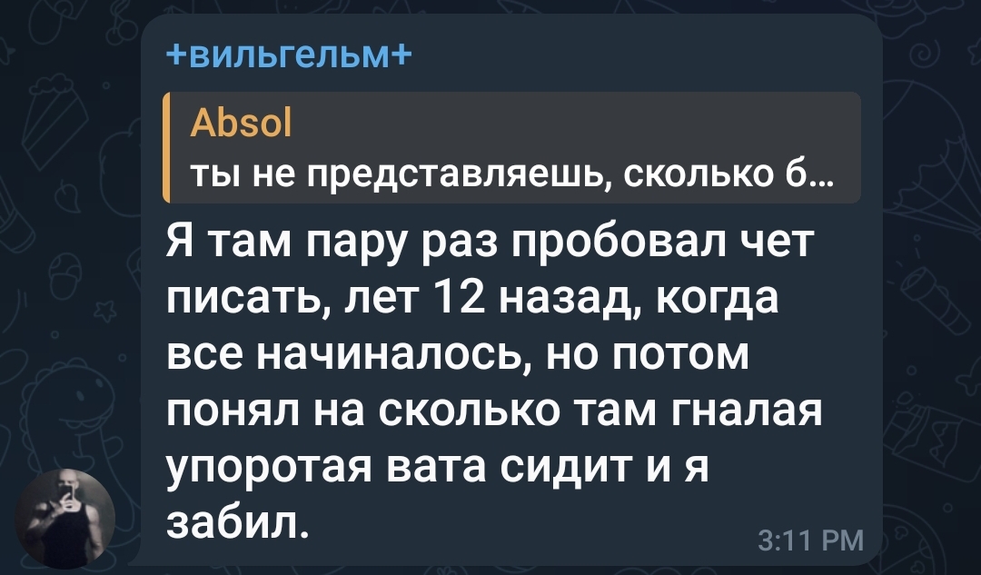 оказывается, в треде чмодья уже какая-то чёрная дыра анархии хуже, чем в /b/ Дафута со своим скулежом про травлю пролетит, как фанера над Парижем, это как просить распылить освежитель воздуха в газовой камере концлагеря, кек