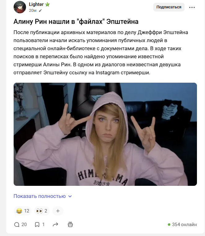 а по моему АНОНЫ...ринша познала эту жизнь и тупо чтобы быть везде в обсуждениях и тд решила ХАПИТЬ на всем...1 пошла в ивент НАСРАЛ (ныла страдала мошнила заняла посл место),.2 пола на стрим ДЖОВА и спалила свою ЖОПУ накладную...3 фаайлы ЭПШТЕЙНА ....бабка ХААйпИТСЯ по полной...что-же будет дальше