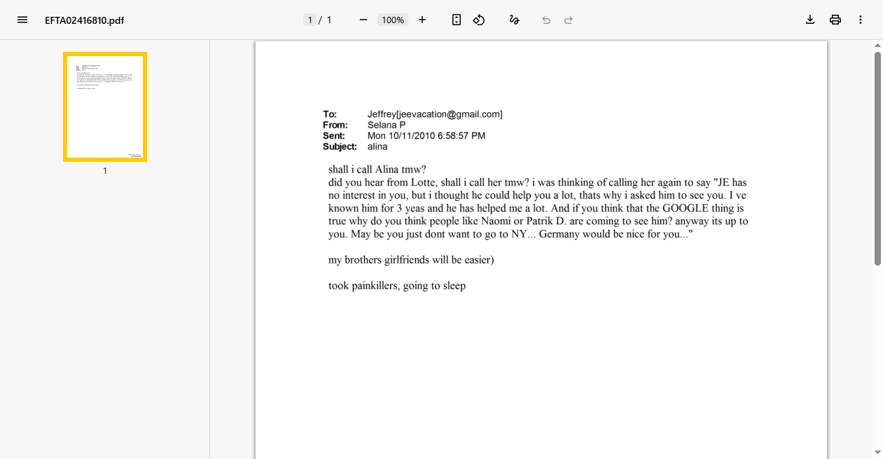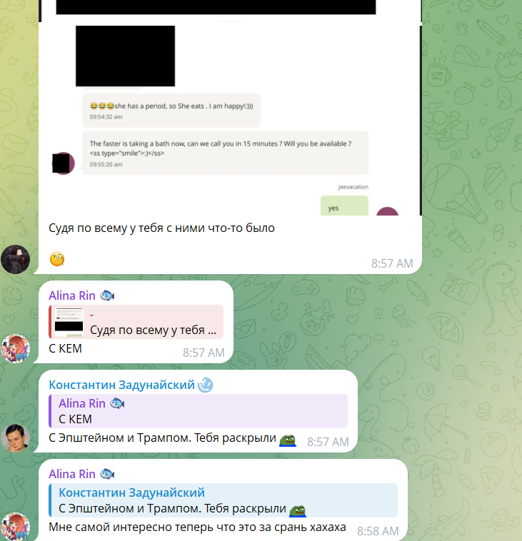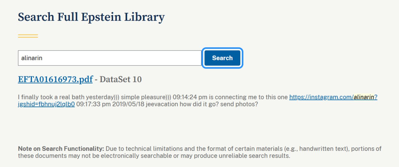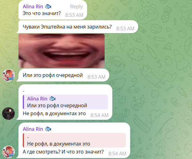 Вы хоть открывали этот файл? Там про встречу с Алиной Рин пишет не Эпштейн, а эскортница с которой он переписывается. Судя по тому что она ставит скобочки ))) она сама из СНГ откуда-то