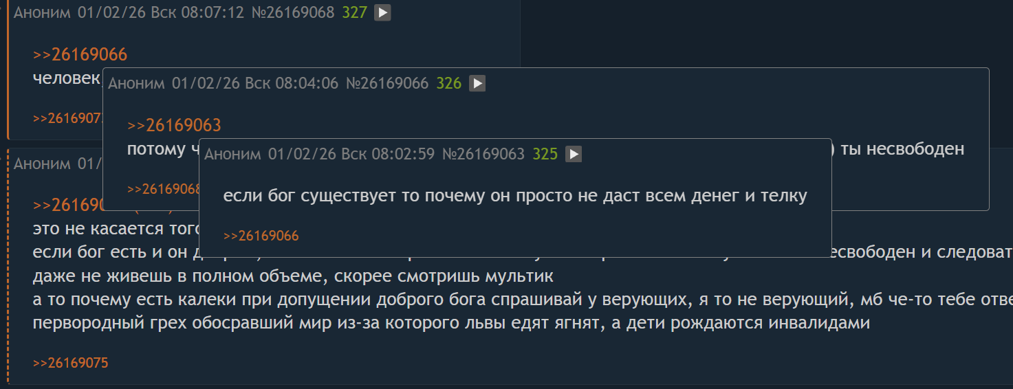 >>26169068 это не касается того почему добрый бог не дает тебе телку если бог есть и он добрый, то он не имеет право отнимать у тебя право на ошибку иначе ты несвободен и следовательно даже не живешь в полном объеме, скорее смотришь мультик а то почему есть калеки при допущении доброго бога спрашивай у верующих, я то не верующий, мб че-то тебе ответят про первородный грех обосравший мир из-за которого львы едят ягнят, а дети рождаются инвалидами