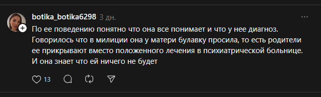 >>26180439 да по идее могла бы, но у неё реально не все дома судя по тому что она говорит как хотела СПАСТИ СВОИХ ДРУЗЕЙ. Кстати забавно что даже в таком состоянии она пишет якобы у нее ХОРОШЕЕ ПРОШЛОЕ