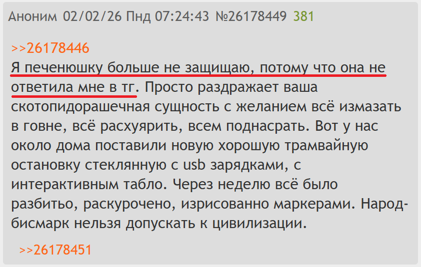 >>26178446 Я печенюшку больше не защищаю, потому что она не ответила мне в тг. Просто раздражает ваша скотопидорашечная сущность с желанием всё измазать в говне, всё расхуярить, всем поднасрать. Вот у нас около дома поставили новую хорошую трамвайную остановку стеклянную с usb зарядками, с интерактивным табло. Через неделю всё было разбитьо, раскурочено, изрисованно маркерами. Народ-бисмарк нельзя допускать к цивилизации.