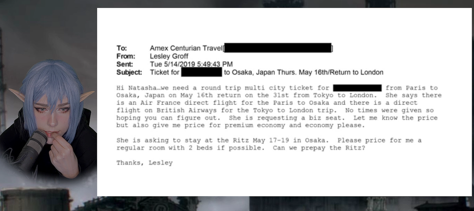 Некий или Некая Лесли 14 мая забронировал билеты в Осаку и номер в Ritz на 17–19 мая, и ровно в эти даты НЕКАЯ уже вовсю шикует в Осаке, подтверждая в чате, что они заселились именно в этот отель.