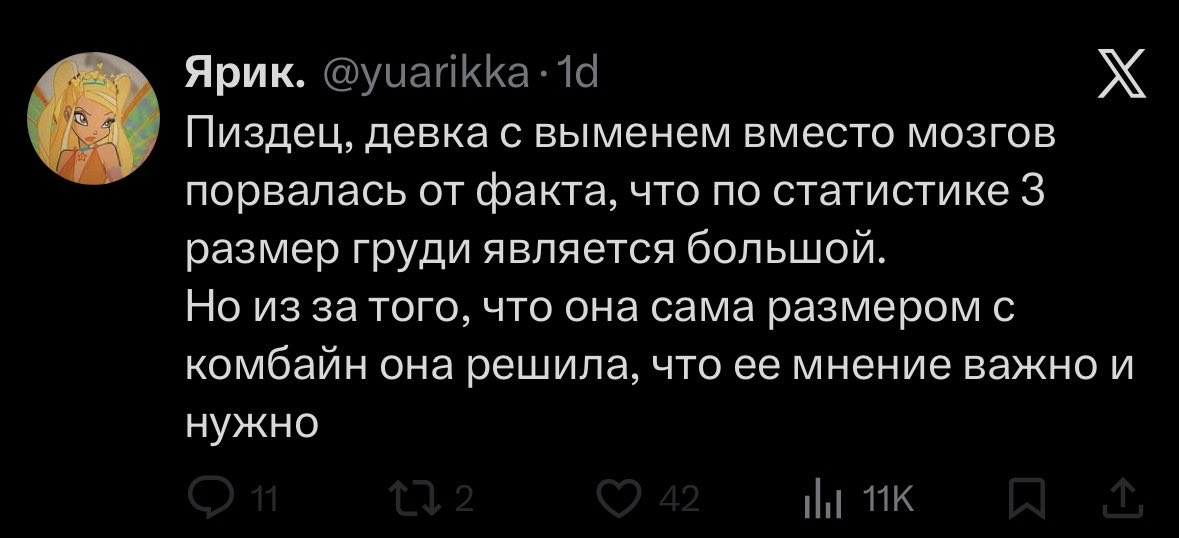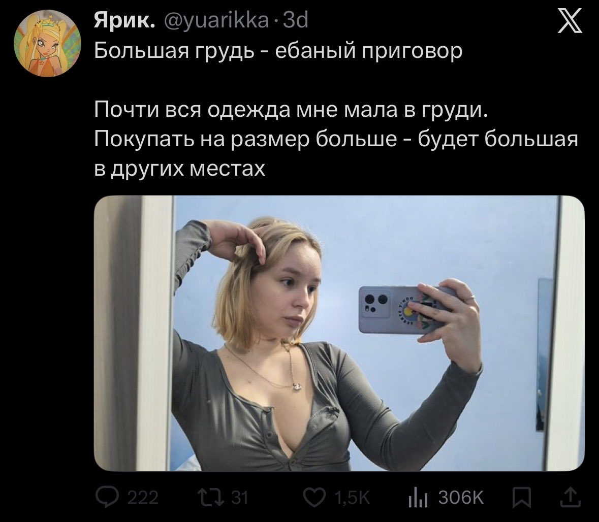 >>26180188 Ебать гнилой байт на твиттере. Ой как плохо мне с большими сиськами пожалейте. Это если бы чел начал ныть, ой как хуево с большим хуем жить, вы не представляете! По ляжкам же натирает! Большой хуй это приговор!