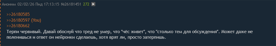 >>26176779 Не терпеть, а игнорировать. Это разные вещи. Тред давно в нормальном чосопригодном состоянии. Ну какой-то залётный прилетел посрал. Игнорируем - как прилетел, так и улетит обратно. Вопрос с компетенцией мочи тоже в прошлом году ещё закрыт. В общем не делаем ничего, помним правила и соблюдаем их. Всё.