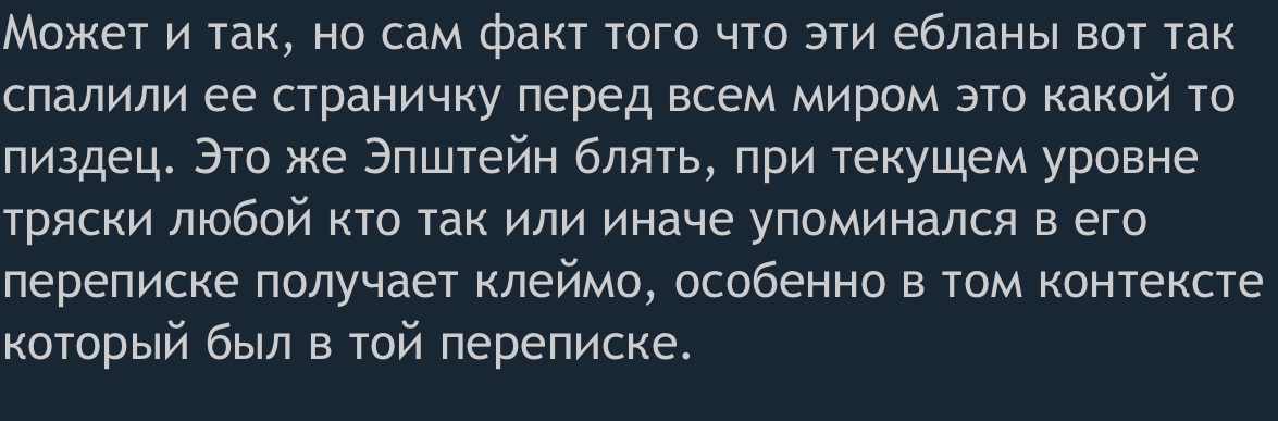 У нее начинает гореть от другого, типа все кто её знают скажут ВААУУУУ на тебя обратили внимание супербогатеи, а по итогу начали хуесосить что она эскортница, поэтому её это начинает выбешивать. Ей абсолютно насрать на ситуацию связанную с файлами эпштейна, её коробит ситуация с эскортом. Я еще помню лет 20 назад в программе ты не поверишь показывали про чела и Мск который поставлял, подбирал жён всяким мажорам, я забыл как его зовут но вы поняли о ком речь. Он уже сейчас старый пердуняра. Так вот какие могут быть удивления если про это показывали по телеку на всеобщее обозрение, это завуалированный эскорт.