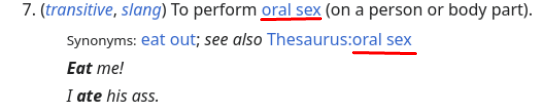 >>26187561 И шизло оборалось как только открыло рот. На первой пикче у тебя eat идет как обозначение орального секса в целом, а не куни. На последующих пикчах какие-то ответы с иностранного мейл-ру, лол.