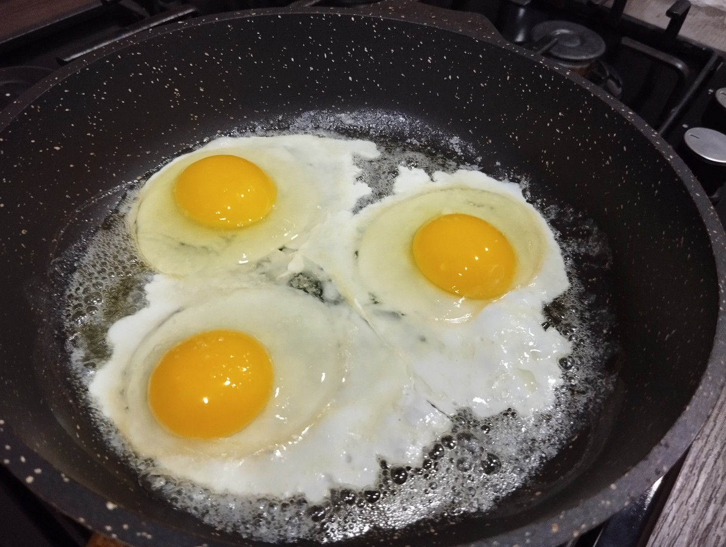 Не накрывать крышкой, на не сильном огне жарить чтобы не пригорало, чтобы белок сворачивался потихоньку.