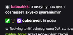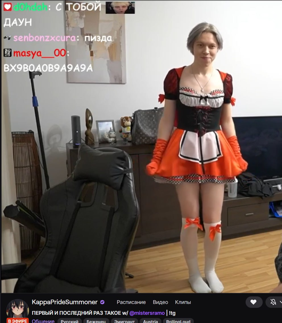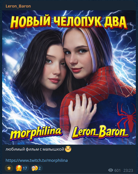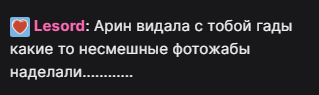 Типок на втором канале, лерон барон, мало писал, но, как только новость про Наташу - сразу перебил все дни по сообщениям и хуесосит Наташу. Он, кста, фанат Морфилины: во всех чатах, где новость про Наташу, он сразу спавнится есть его ник на твиче?