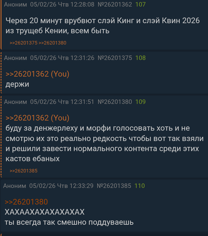 >>26201362 буду за денжерлеху и морфи голосовать хоть и не смотрю их это реально редкость чтобы вот так взяли и решили завести нормального контента среди этих кастов ебаных