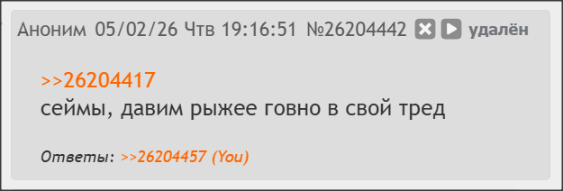Вы только вдУУУУмайтесь: Сколько раз тредовские плакались мочухе из-за калнормы, сколько репортили и что в итоге? Проткнула его "рыжая" крашенная марамойка. Да так, что он даже ответить ничего не может - просто молча вайпает )))0))