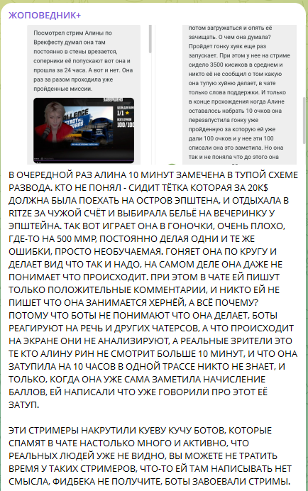 >>26209761 ты заебал со своими грустницами, мы их(грустницу и марго робби) мониторили всем тредом. Они накрутили 260 онлайна и сидели с ними месяцами, всегда люди залетали на эти 260 онлайна и там 2 человека в чате общаются. У марго это ее топ донатер и ебырь модер. У грустницы муж аслан. Никто там не сидел и не смотрел никого. Рыжопича по странной хуйне косарь месяца два продержала, потом 700 держала месяца полтора, потом 300, и ща вот 120, когда уже совсем скучной стала, медленно до 20 дойдет уже скоро. Не переживай. Больше предложку одной кнопкой удаляйте с кизером