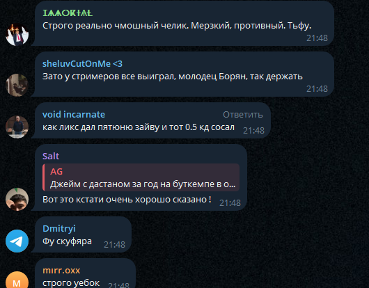 симпы шкуры умудрились и во время стрима высрать хуйню, обосраться и слиться, всё на человека который благотворительностью занимается и держит на плаву который год медийно, а теперь и сам стримит отстримливает после целого дня на стримах на её канале на онлайн x5-10 от авг , никто даж в теории такой хуйней бы не страдал