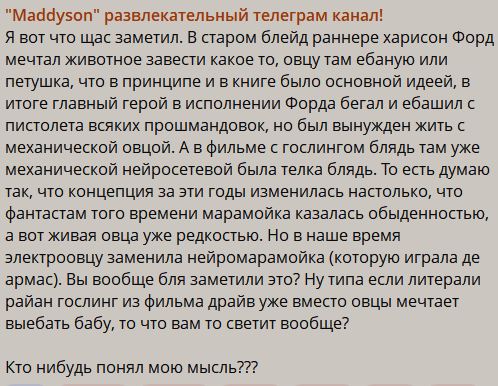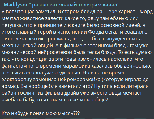 Гайз, а вы тоже раньше плевались от ПАЦАНСКИХ фильмов, мол их смотрит быдло, а вы, типа, нихуя не быдло. Вы - утонченная креветка и всё такое? Я вот таким был. А сейчас с таким кайфом, будучи скуфом, пересматривать/впервые глядеть любимые "быдлом" фильмы. Наверно, это и называется что-то вроде компенсации мужского.
