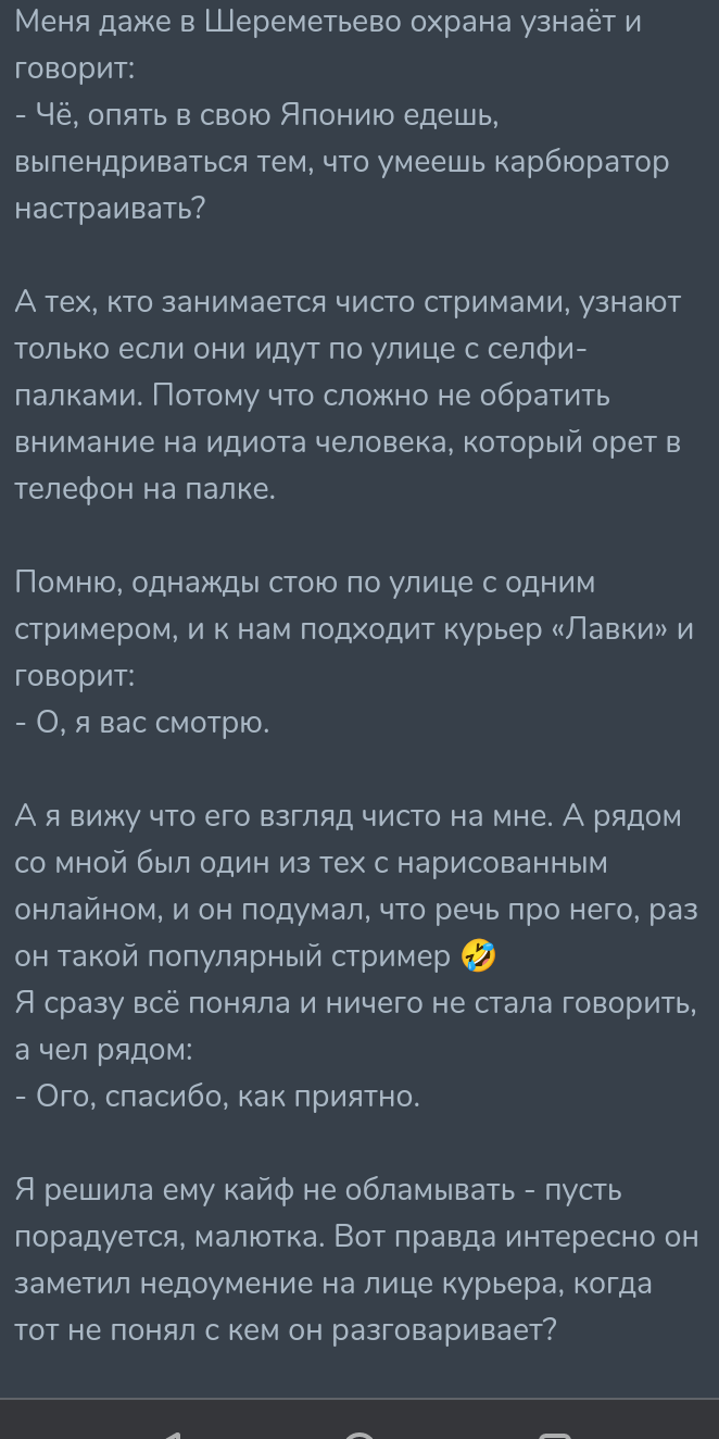 >>26235264 Невыдуманные истории, о которых невозможно молчать, про Шереметьево, и про то как стояла посреди улице с другим стримером, тут бы дело затрястись, а что это за стример такой, ебёт шлюху? но даже преданные коляски её истории кроме как за пиздешь не воспринимают