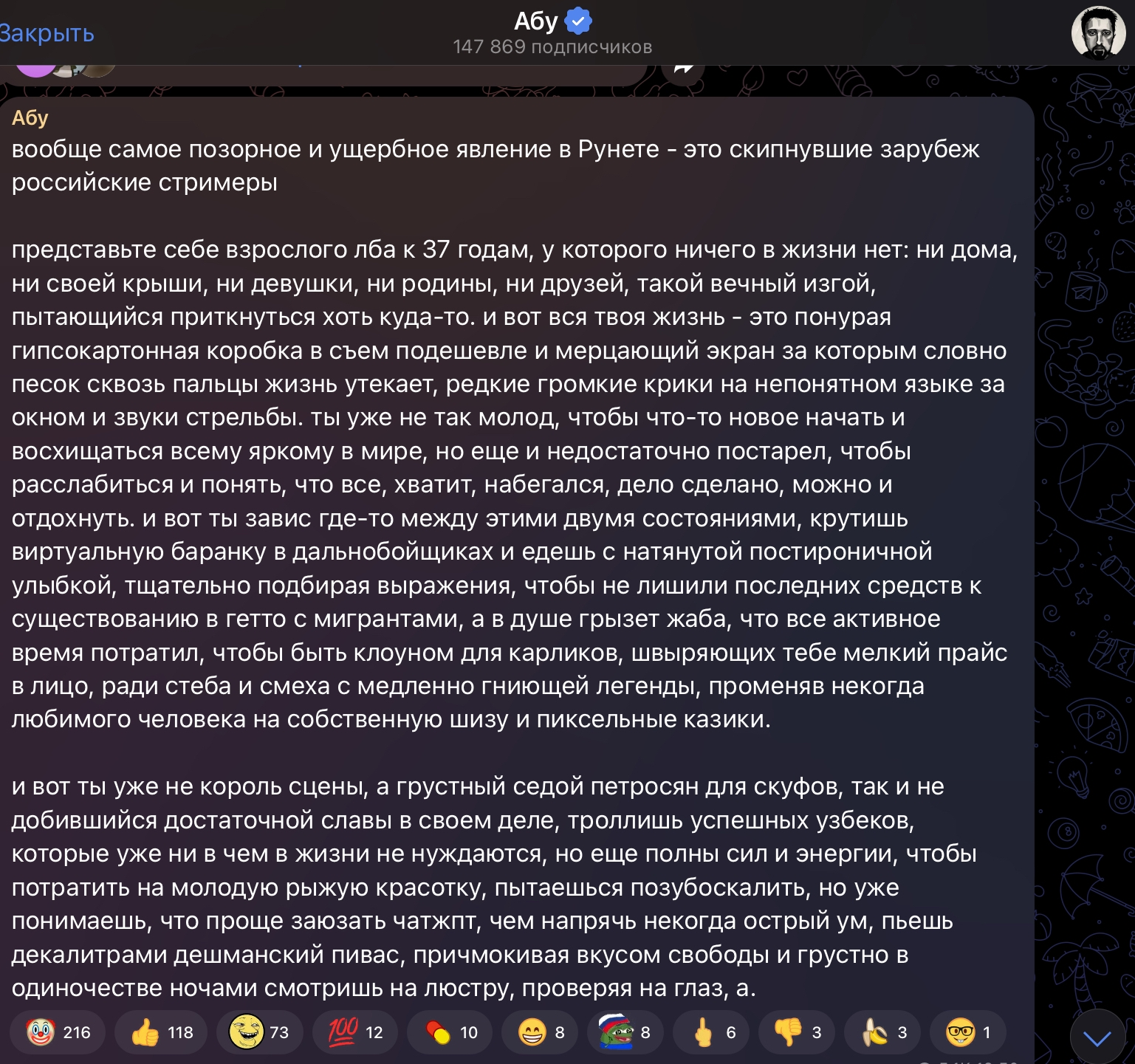 Крышу там пиздец рвёт от желания доказать, что всеми всюду узнаваема, да ещё и не накручивает, в отличие от никому неизвестных других стримеров с нарисованным онлайном. В прошлый раз ноунеймом Равшан был, а в этот кто этот бедолага, которому показалось, что его кто-то там узнал, неужели Бустер?