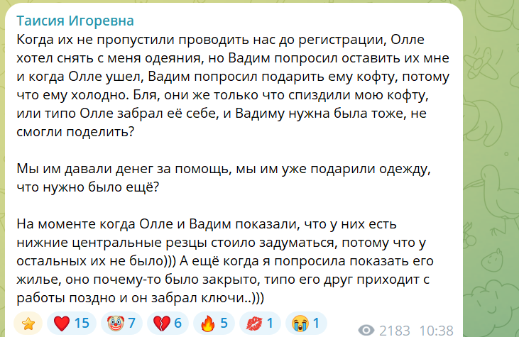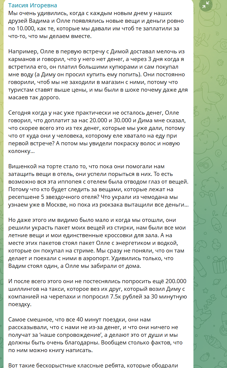 Но даже этого им видимо было мало и когда мы отошли, они решили украсть пакет моих вещей из стирки, нам были все мои летние вещи и мои единственные кроссовки для зала. А на месте этих пакетов стоял пакет Олле с энергетиком и водкой, которые он покупал на стриме. Мы сразу не поняли, что он там делает и поехали с ними в аэропорт. Удивились только, что Вадим стоял один, а Олле мы забирали от дома.