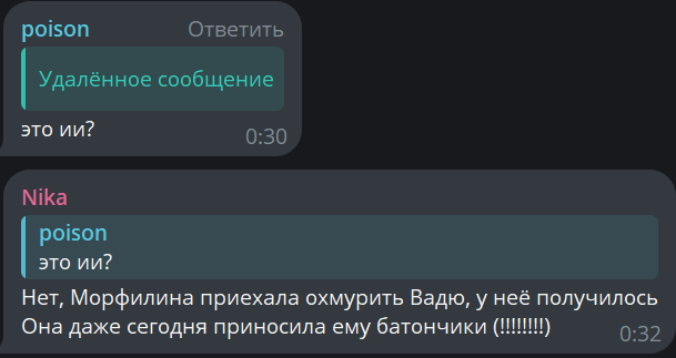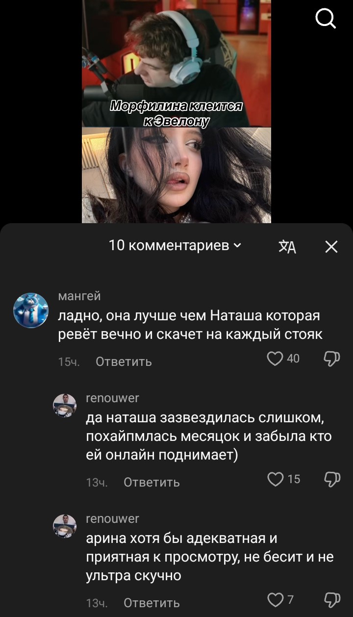 Кстати не хочу придумывать лишние теории, но у Наташи в комментах было ИИ фото с поцелуем Вади и Морфилины, она удалила)))) При этом оставила пикчи где Вадя грустный, а она с аринкой обнимается, вот и думайте