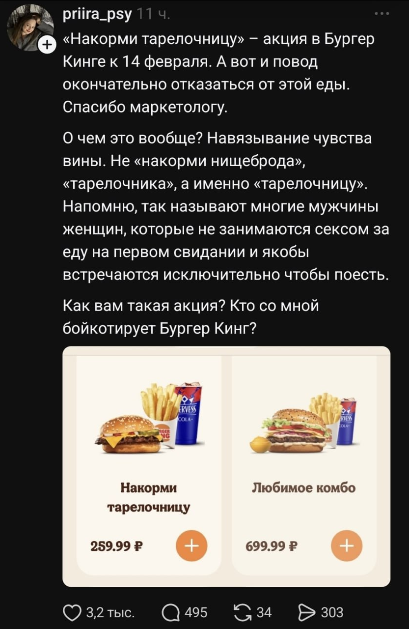 >>26252575 Чел эм я тебе открою секрет но целевая аудитория бургеркинга это зумеры. Туда не ходят пенсионеры, скуфы и тд. Максимум ещё миллениалы. И ещё один секрет: абсолютное большинство зумеров сейчас это абсолютно промытые соевые хуесосы поддерживающие феминизм и осуждающие любые уколы в адрес женщин. Мы ничем не отличаемся от загнивающего запада в этом плане. Просто у нас во власти люди с другими взглядами и поэтому они пытаются это как-то маскировать. Но тем, кто взаимодействовал с зумерами в ирл это очевидно. Ну и миллениалы тоже в огромной степени соевые. Поэтому отрезать от себя бóльшую часть ЦА чтобы привлечь меньшую часть ЦА это не гениальный маркетинговый ход. Как минимум 50% зумеров это женщины. А они все как одна феминистки, даже если некоторые напрямую так себя не называют.