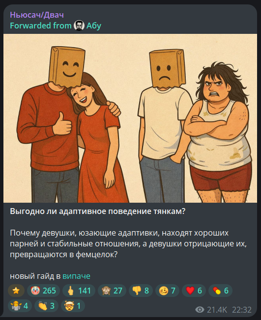 А я вот как скуф для которого Ну заяц погоди мультик из детства и которого смотрит Мэд тупо топ. Он еще и пересказывает прикол про фембоя зайца и пидора волка. Ну Илья...