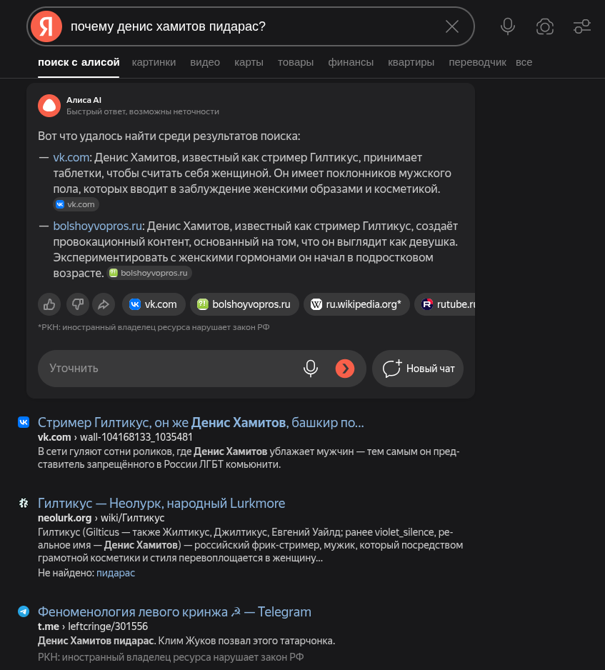 чтоб были хейтеры, надо чтоб были зрители, у этого говна коровьего кроме ботов дианочки зрилов нет, одна шмарадаунская отрыжка башкирская сидит в треде и срет этим калом, прибанят эту хуету за постинг нерелейтед пизды на 15 зрил и вновь никто не вспомнит эту хуету паджитскую годами нахуй, пока в мафию не позовут, и то будет один пост "ебать этот урод с синяками под глазами, чтоб он сдох"
