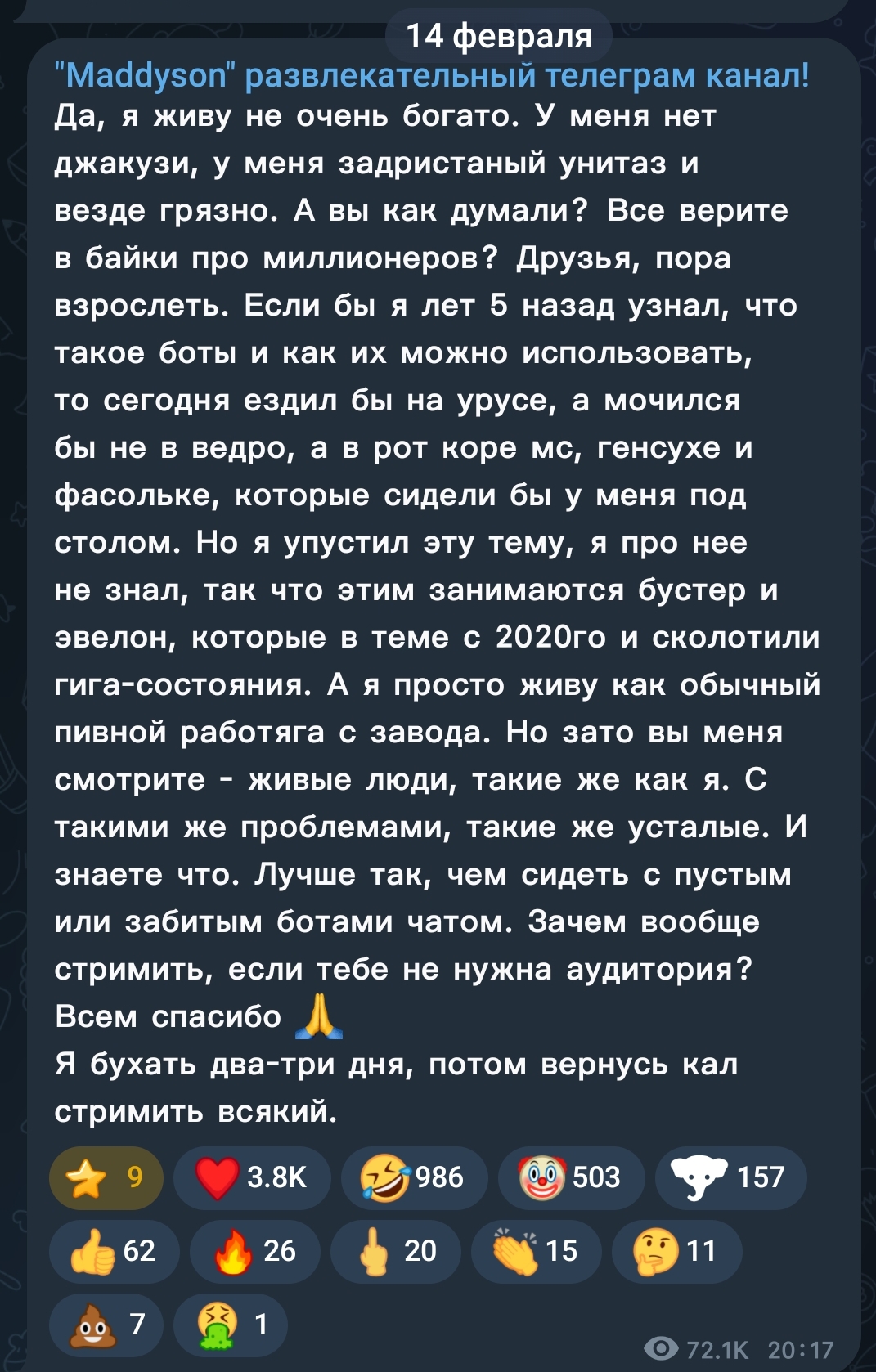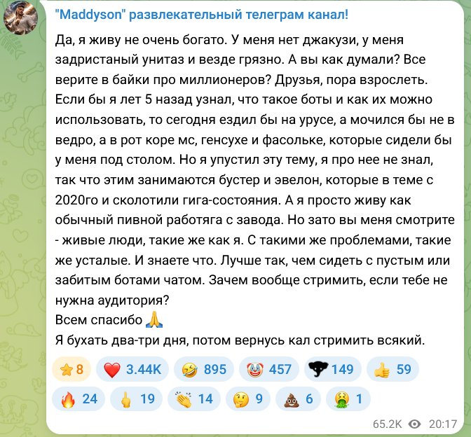 Стримить думаю начать. Притворюсь нищей провинциалкой с психическими нарушениями, само собой без парня, стану симпов на донаты греть. Так и разбогатею. Как вам план?