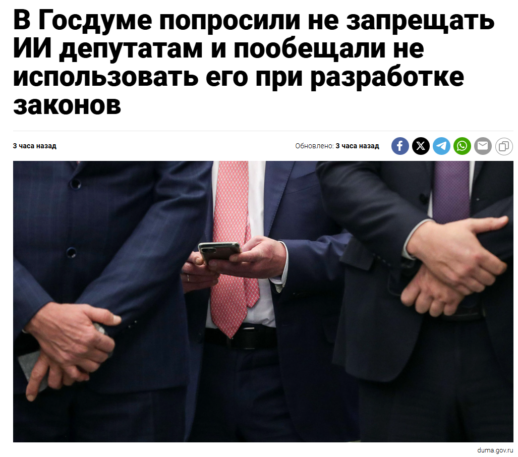 сидиш такой в госдуме и нихуя не делаешь, чатГПТ за тебя все законы пишет, а ты видосики в телефоне смотришь, пиздишь со своими по 5 часов и в жопе ковыряешься