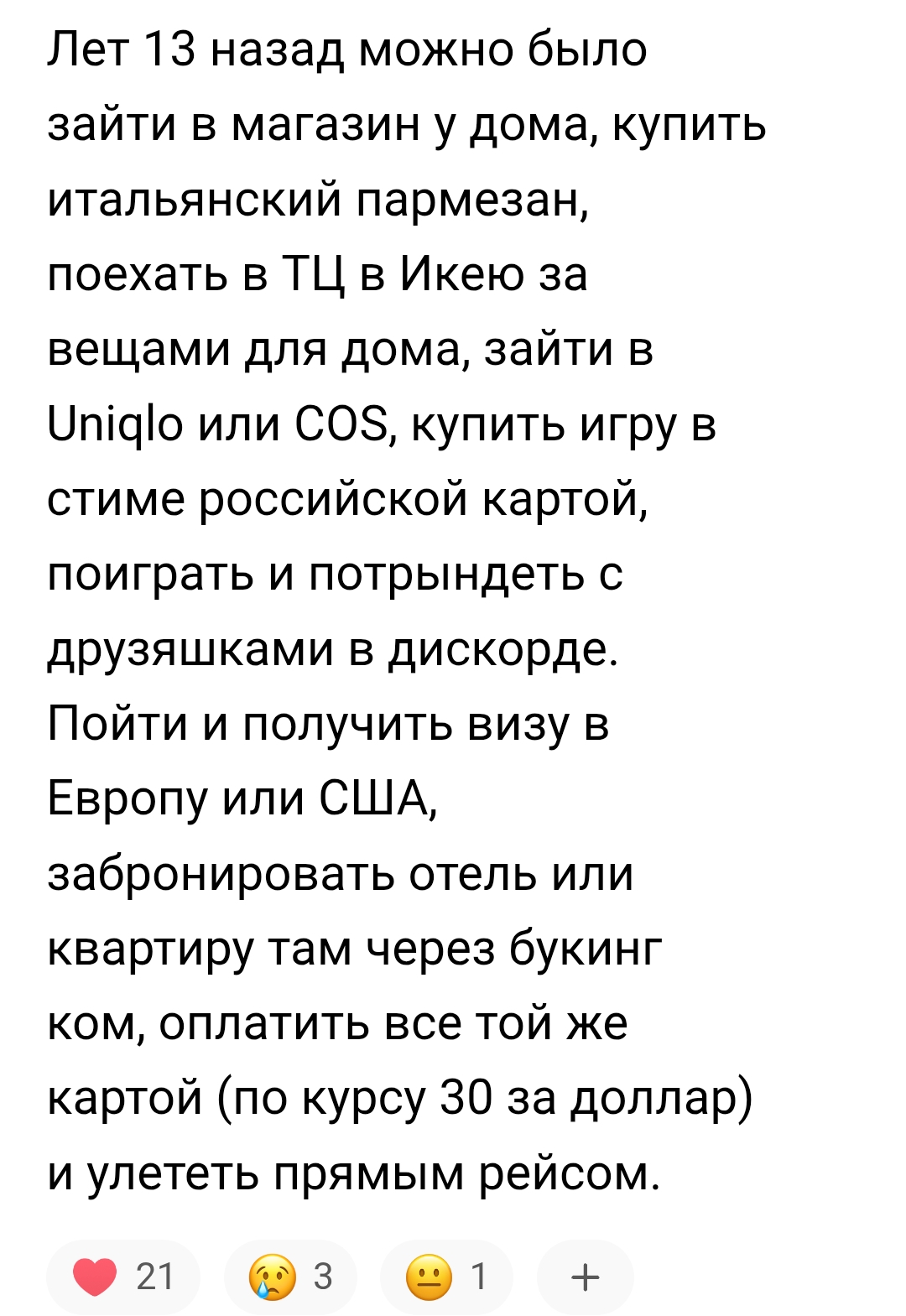>>26299141 ну в целом верно конечно, разве что вещи из икеи это кал нищебродский, как и юникло хз дерьмо с озона по-моему успешно это все заменило а вот по деньгам да хуже стало. но у меня такое чувство есть, что без движухи было бы примерно так же с рублем, просто для этого не было бы оправдания