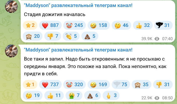 Да всё медисон сдох. Алкашка вин. Чел буквально всрал пивандрием свой мозг. Теперь только перманентная дипрессия, с короткими вспышками попыток всё исправить ПО-БЫСТРОМУ это самое любимое теперь у Илюхи якобы он может там что то за пару недель исправить и подкачался привести себя в форму. Ну тупа копиум короче как обещания начать с понедельника. Всё эти авральные попытки вытащить себя из алкоговна только вредят и делают в дальнейшем перспективе хуже, слишком велик стресс из за такого подхода и соответственно неизбежен новый срыв в алкаху. Нужен системный подход, почему тупой алкоскот этого не понимает....