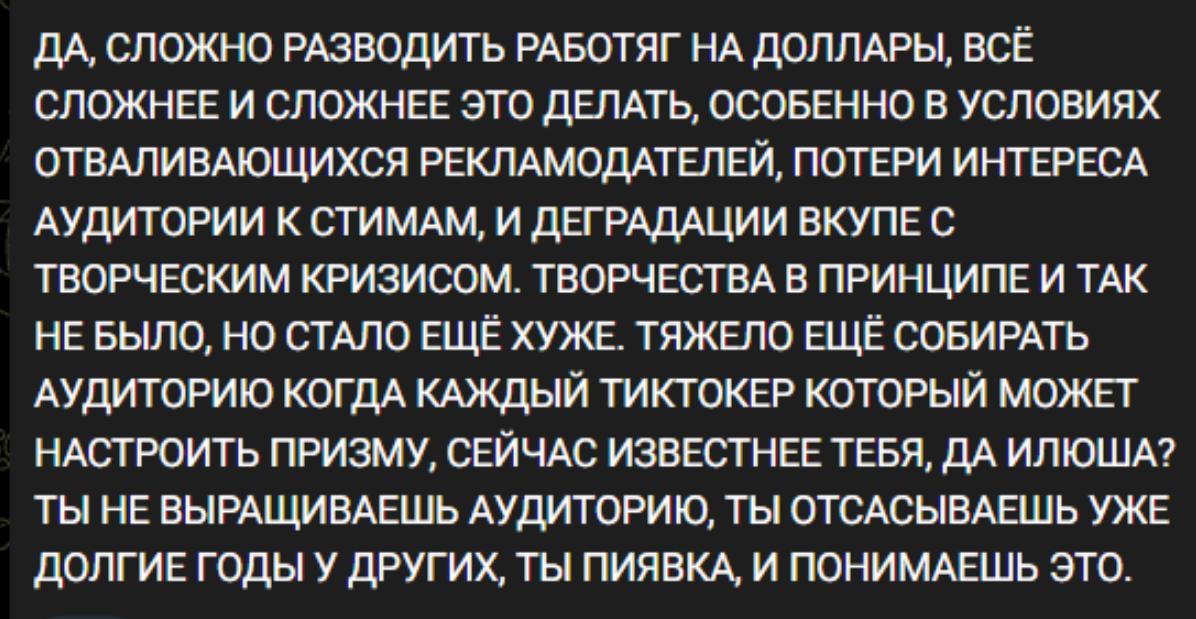 >>26313339 Почему обезумел? Ему реально похуй. Он такой весь постироничный типа пацаны ну это рофл такой, я как бы скамлю, но это не скам, а полурофл, вы поняли же, да? Это я к чему, захожу на последний хайлайт и что я вижу? Рекламу купикод, после их зашквара, скама и угроз, когда рекламировать их контору вроде как западло всем, а Жопичу поебать, постирония же.