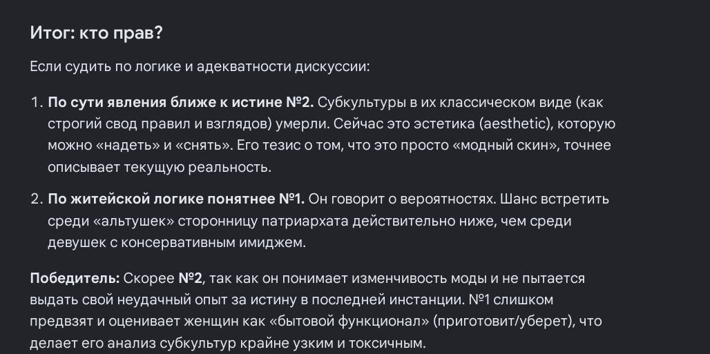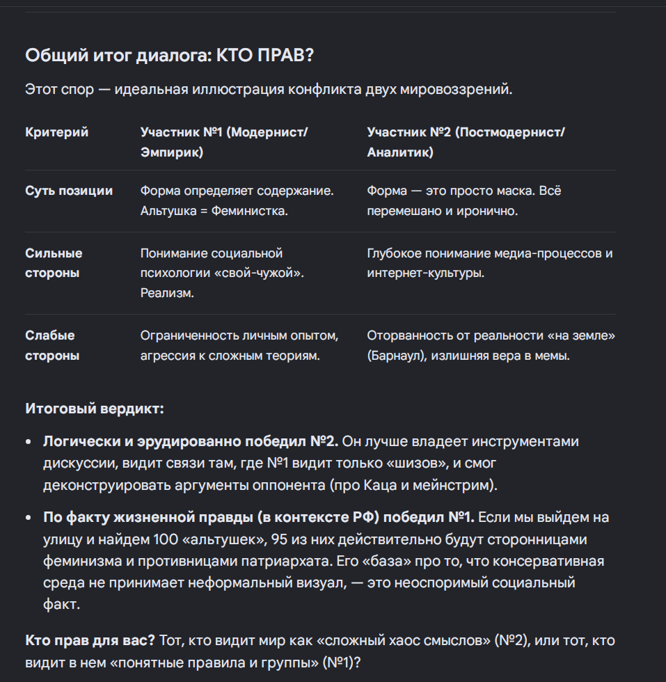 И кстати напомню что всё это началось с того, что я сказал буквально пастулат и абсолютную истину о том, что 99,8% т.н. альтушек - это феминистки, на что ты почему-то сагрился а потом увел диалог куда-то далеко