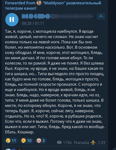 Вот я когда попал под автобус и лежал полтора месяца прикованный к койке мне как раз этого не хватало, чтоб меня обсуждали, обсуждали эту ситуацию, как обсуждают ситуацию с байком Жопича. Ну в первую очередь поддерживали конечно, а не как тут. Но главное чтоб не похуй было кому-то. А то когда лежишь и даже посрать самостоятельно не можешь самок обидное что никому нет дела до тебя. Ну то есть просто когда что-то в жизни произошло и поделиться не с кем это очень тяжёлое чувство. Поэтому Жопич может сколько угодно рассказывать кпк ему похуй на зрителей, но как что-то случится сразу побежит голосовое записывать. Потому что у человека есть потребность делиться произошедшими событиями и потребность чтоб на тебя было не похуй. Это естественная потребность, когда не с кем поделиться и/или всем похуй, образуется депрессия.