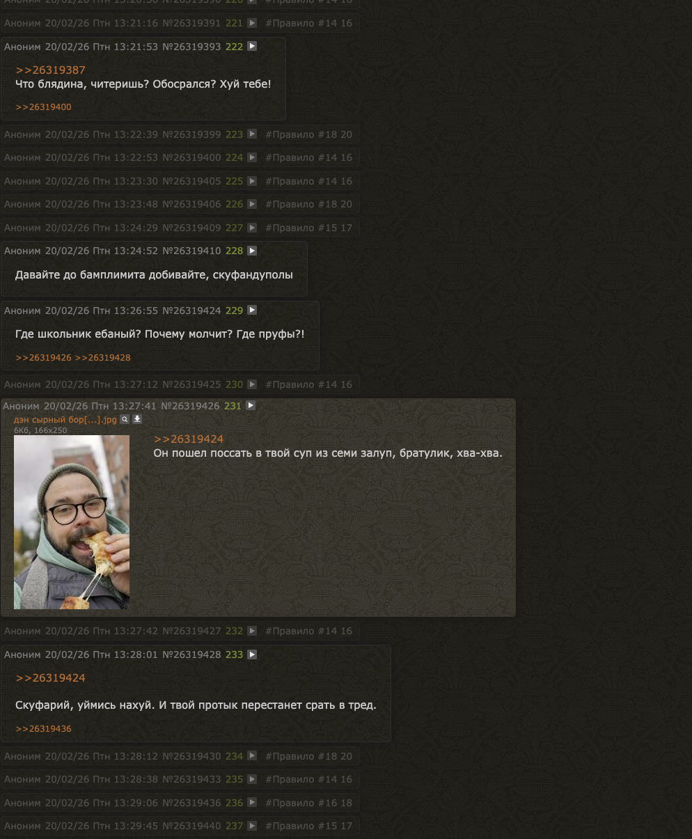 >>26318904 Тоже репорчу шизика, но пока ни разу не потёрли, также как и серуна сырным нерилейтед хомяком. Модер пошёл закладку поднимать и на сво уехал походу.
