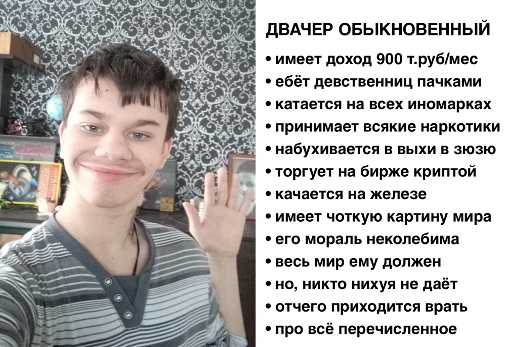 Мне зумерши кидали фотки в лс и просили оценить их внешку, это такой пиздец, ну я писал, типа ты заебись, а что ещё можно сказать про зумерш? Ну были чутка полные или стройные, но это один хуй молодые шлюхи, там просто не до чего доебаться. Только инцелы вроде вас искали бы в них изъяны, типа нос не такой и тому подобное. По факту, большинство зумерш охуенные. Хотя зумеры из чата их хуесосили, говорили, что они стрёмные. Я им говорил, что вы долбоёбы, вам такие бабы даже за бабки не дадут. Но там и зумеры типичные, худые, с челюхой, с дошираком на голове. Короче зумеры все ебанутые, я троллился с ними, они отбитые наглухо.