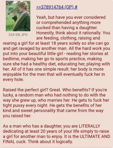 >>26350128 Дочери носительницы твоих генов. Для девочек естественно быть отъебанными мужиками это заложено природой, девочкам нравится секс с мужчинами,девочки живут дольше. Девочки красивее мужчин.