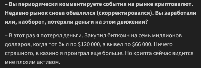 – Вы периодически комментируете события на рынке криптовалют. Недавно рынок снова обвалился (скорректировался). Вы заработали или, наоборот, потеряли деньги на этом движении? – В этот раз я потерял деньги. Закупил биткоин на семь миллионов долларов, когда тот был по $120 000, а вывел по $66 000. Ничего страшного, в казино я проиграл еще больше. Но крипта сейчас видится мне плохим активом.