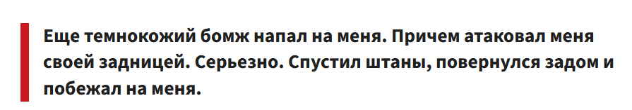 >– Какими главными качествами должна обладать ваша потенциальная супруга? "– Я бы хотел молодую жену с сочной [задницей], большой [грудью] и ростом 185 см. Желательно голубоглазую блондинку. И чтобы зарабатывала хотя бы пару миллионов долларов в год. Готовила и убиралась, стирала мои грязные трусы. На меньшее я не согласен из принципа." И в чём он не прав, тут никакой постиронии абсолютно, просто базовая необходимость так сказать, любой адекват согласится