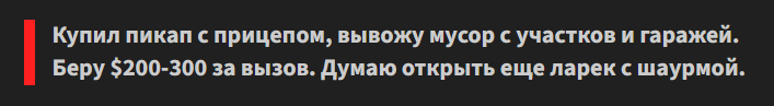 >Купил пикап с прицепом, вывожу мусор с участков и гаражей. Беру $200-300 за вызов. ООАООАО