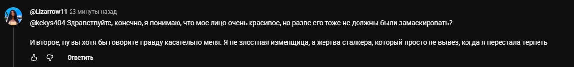 >>26464620 Я видел коммент Аслана или Леры, ник Картошка, ну скорее это Аслан писал. Демон отписался тоже, написав что ролик поверхностный и дилетантский, ну это правда можно было сделать более ёмкий и внушительный лор. Ну и Лиза приползла оправдываться что она не изменщица и жертва сталкинга от Пчелы ахахха, да и вообще почему её ебло не замазали ведь ей стыдно.