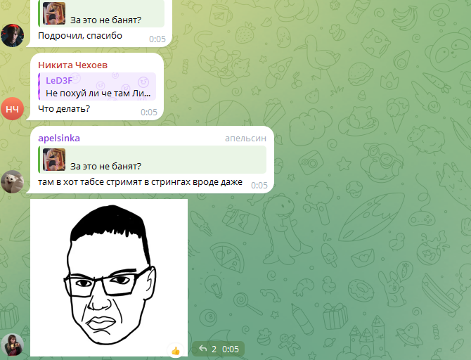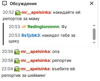 Лиза стримит треш контент ебаный нарушающий правила платформы. нахуяривается в зюзю, не следит вообще за тем как идет стрим, что демонстрируется на нем. среди всех сообщеий про репортики ей присылают мои - всё, я виноват. и Ульяне надо меня забанить. и прекратить со мной общение. иначе она угрожает не дружить с Ульяной уже. хорошо что я про это написал, а то бы пришлось другого виноватого искать. а если бы таких не было виноват бы стал кто-то из модеров потомучто хуй знает, категорию не поменял, ведь забанили её не за жесткие высказывания, когда я писал "репортик" а за неприемлемую одежду, потому что она где-то пол часа стримила девочку в купальнике без категории