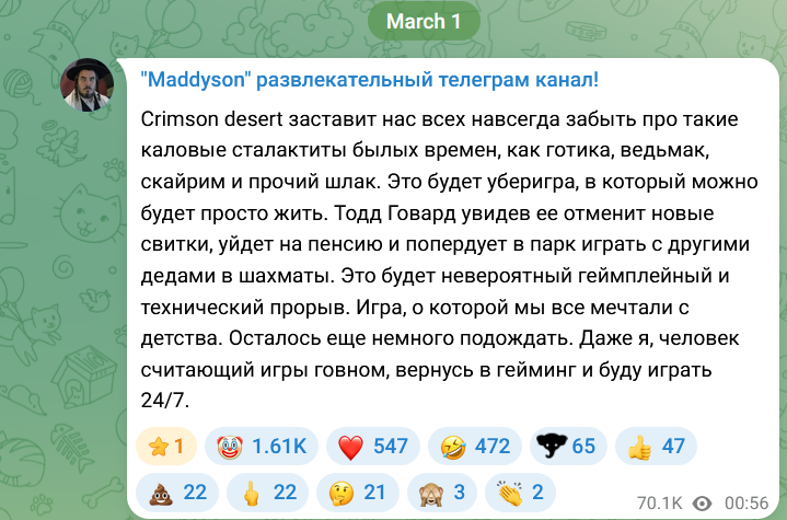 Мадье каждый месяц какую то кало ммо форсит говорит это будет игра столетия потом после релиза пукнет "это кал малые разрабы обосрались мех линейка вот бы кто сделал нормальный сервер линейки я бы попиарил" и это каждый раз происходит