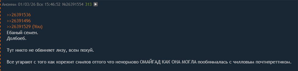 >То есть Лору в твоих глазах тоже педофил? Как ты это вообще связал? Педофилыч апельсимп помешан наглухо на ненорме будучи НИКЕМ, буквально НИКЕМ, какая тут может быть у него заинтересованность? Только какие-то психологические извращения и сублимация либидо путем говорить что и как делать, это частая форма у педофилов.