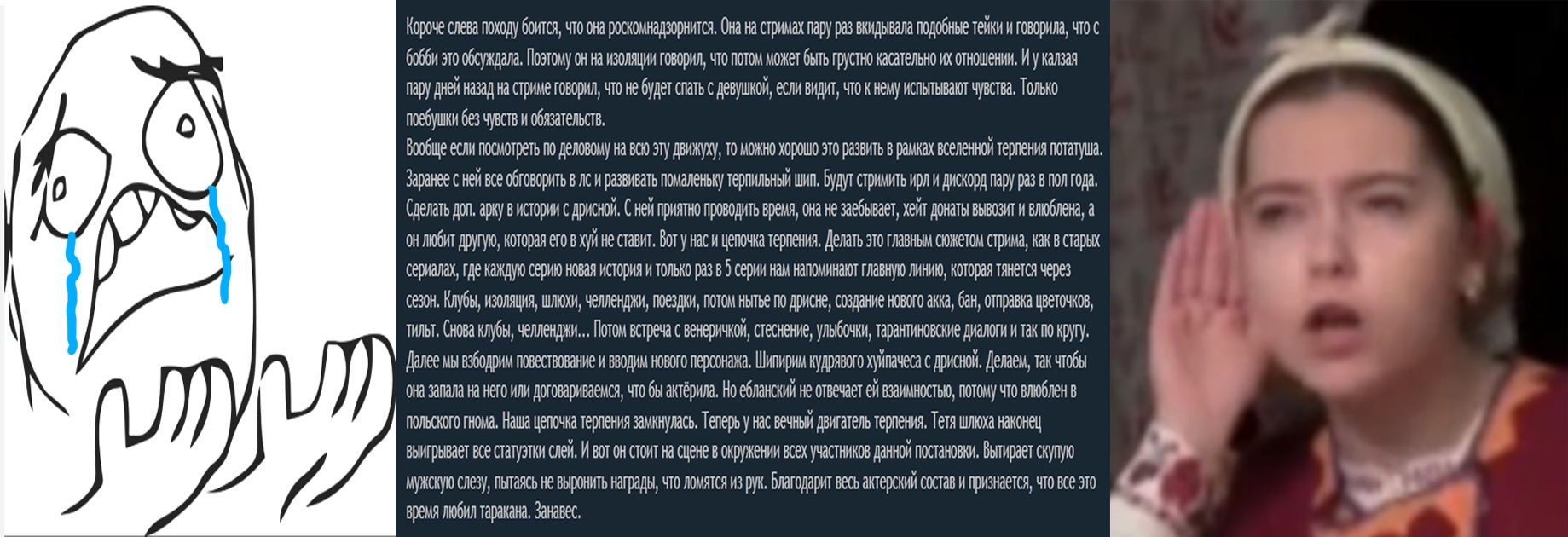 Короче слева походу боится, что она роскомнадзорнится. Она на стримах пару раз вкидывала подобные тейки и говорила, что с бобби это обсуждала. Поэтому он на изоляции говорил, что потом может быть грустно касательно их отношении. И у калзая пару дней назад на стриме говорил, что не будет спать с девушкой, если видит, что к нему испытывают чувства. Только поебушки без чувств и обязательств. Вообще если посмотреть по деловому на всю эту движуху, то можно хорошо это развить в рамках вселенной терпения потатуша. Заранее с ней все обговорить в лс и развивать помаленьку терпильный шип. Будут стримить ирл и дискорд пару раз в пол года. Сделать доп. арку в истории с дрисной. С ней приятно проводить время, она не заебывает, хейт донаты вывозит и влюблена, а он любит другую, которая его в хуй не ставит. Вот у нас и цепочка терпения. Делать это главным сюжетом стрима, как в старых сериалах, где каждую серию новая история и только раз в 5 серии нам напоминают главную линию, которая тянется через сезон. Клубы, изоляция, шлюхи, челленджи, поездки, потом нытье по дрисне, создание нового акка, бан, отправка цветочков, тильт. Снова клубы, челленджи... Потом встреча с венеричкой, стеснение, улыбочки, тарантиновские диалоги и так по кругу. Далее мы взбодрим повествование и вводим нового персонажа. Шипирим кудрявого хуйпачеса с дрисной. Делаем, так чтобы она запала на него или договариваемся, что бы актёрила. Но ебланский не отвечает ей взаимностью, потому что влюблен в польского гнома. Наша цепочка терпения замкнулась. Теперь у нас вечный двигатель терпения. Тетя шлюха наконец выигрывает все статуэтки слей. И вот он стоит на сцене в окружении всех участников данной постановки. Вытирает скупую мужскую слезу, пытаясь не выронить награды, что ломятся из рук. Благодарит весь актерский состав и признается, что все это время любил таракана. Занавес.